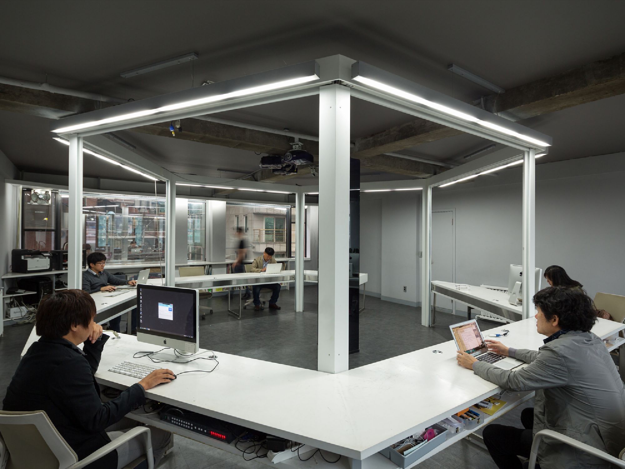SCALe’s hexagonal office features vary in real time to meet the various requirements of modern office spaces. There are a variety of sensors, projectors, LEDs, variable screens, and control apps that transform this space into an office, seminar room, conference room, media gallery, immersive venue, performance hall and DJ club.